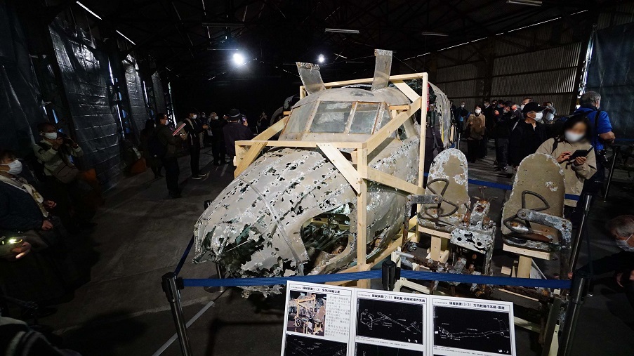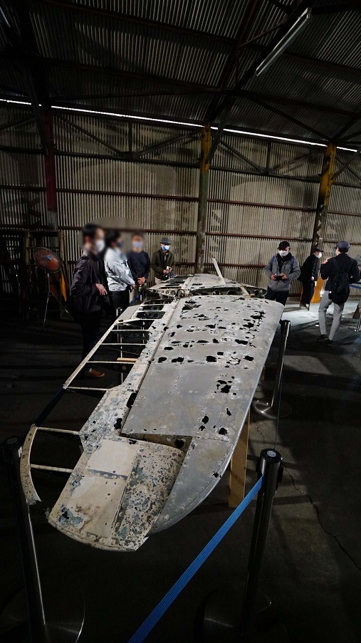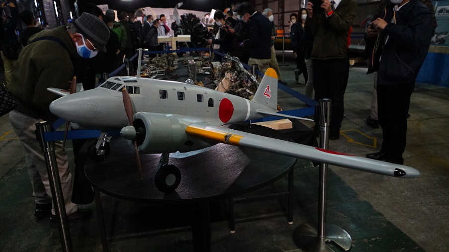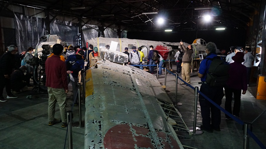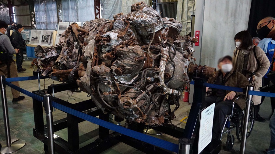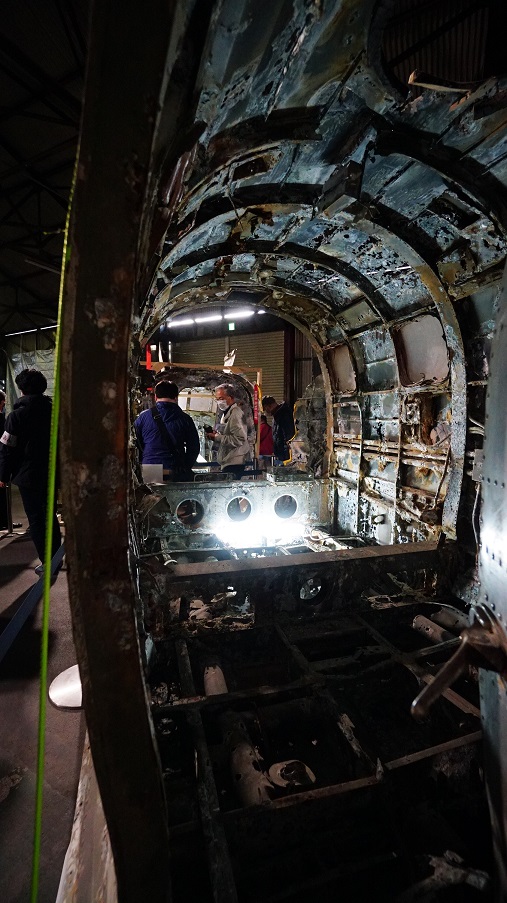 この機体は1943年に十和田湖に不時着水して水没したものです。2010年に発見され2012年に引き上げられ、青森県立三沢航空科学館で展示されていました。今回立飛HDに移譲され一般公開されました。今後も一般公開の意向があるようです。エンジン1基は製造企業の後継企業である日野自動車の日野オートプラザで展示さていましたが、今回機体と一緒に展示されました。