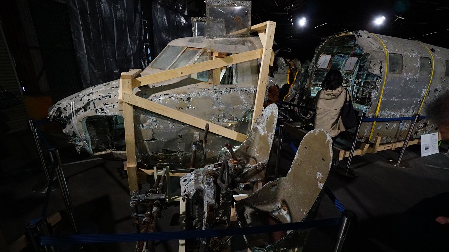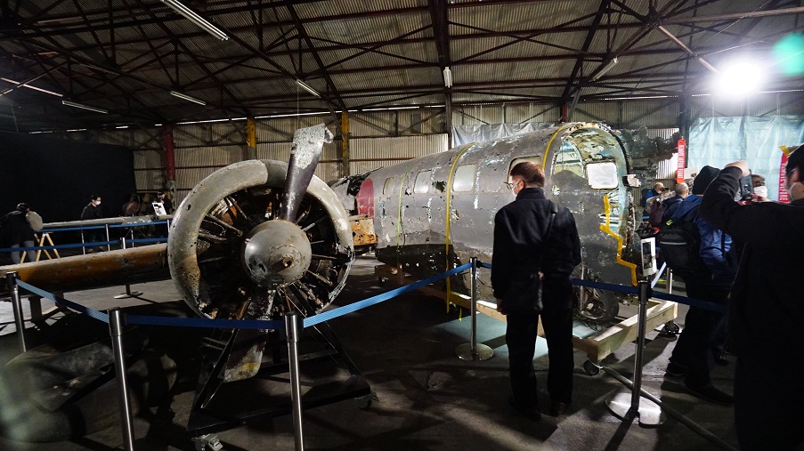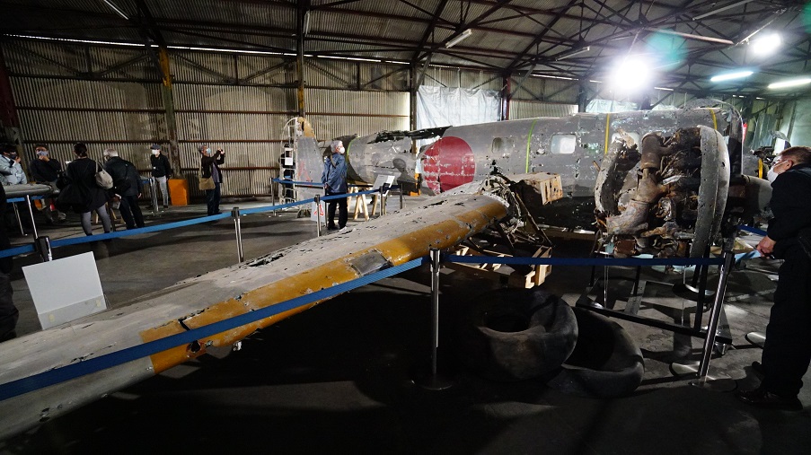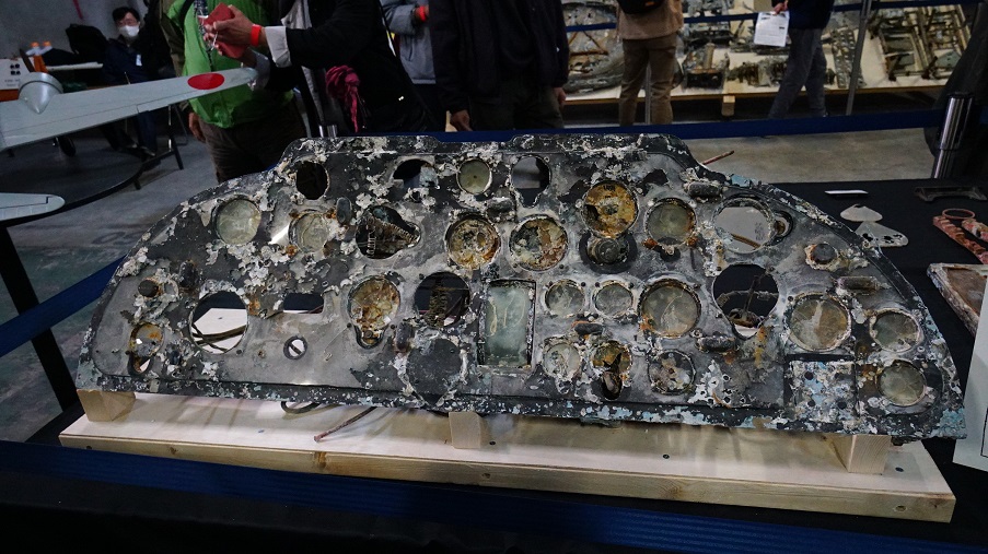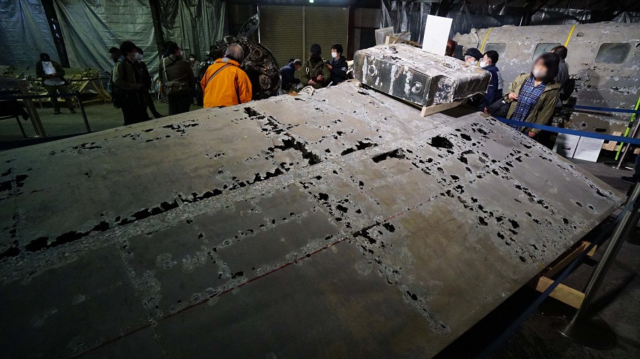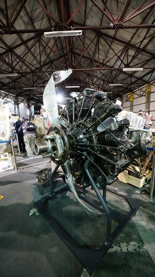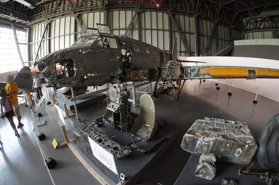 この機体は1943年に十和田湖に不時着水して水没したものです。2010年に発見され2012年に引き上げられ、青森県立三沢航空科学館で展示されていました。今回立飛HDに移譲され一般公開されました。今後も一般公開の意向があるようです。エンジン1基は製造企業の後継企業である日野自動車の日野オートプラザで展示さていましたが、今回機体と一緒に展示されました。
